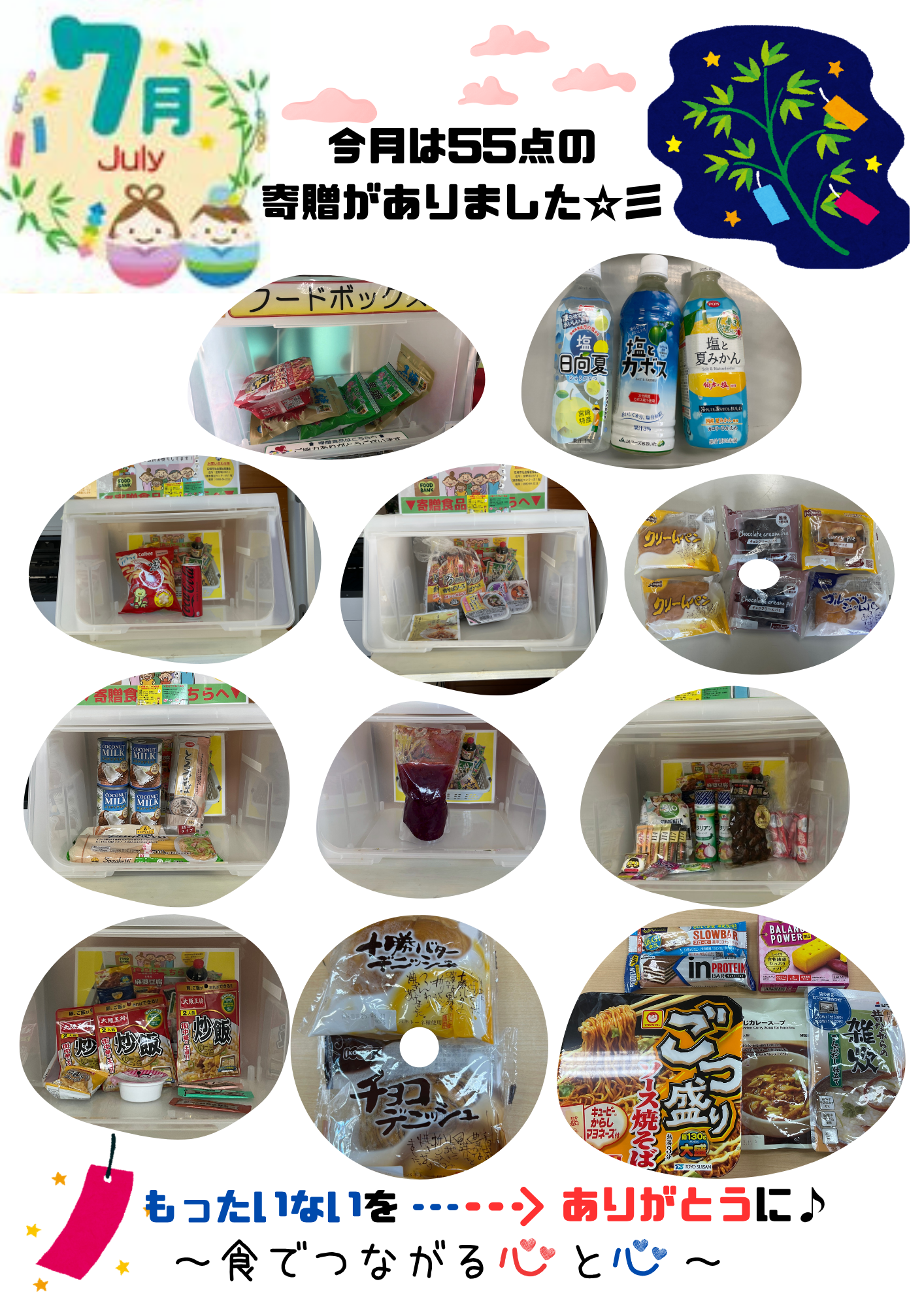 市内の郵便局や健康福祉センターに設置されているフードボックスに、7月は55点のご提供がありました。ありがとうございました!
