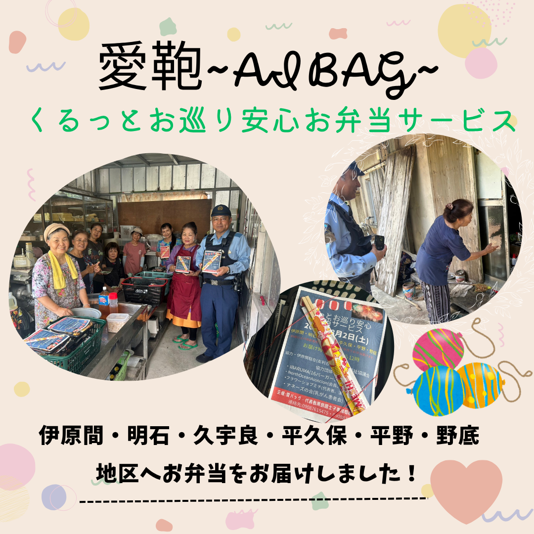 愛鞄くるっとお巡り安心弁当サービスは、北部地区で月1回のお弁当orおやつのサービスをはじめ、活動拠点の伊原間地区では適宜訪問活動を行っております。また、活動にご協力いただける方も募集中です☆