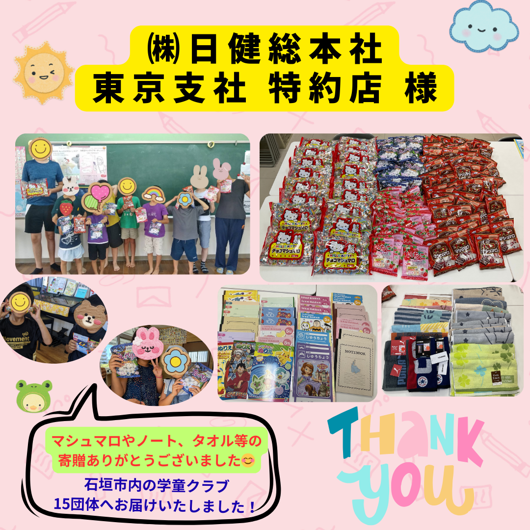 ㈱日健総本社 東京支社 特約店 様よりお菓子等220点(マシュマロ・ノート・タオル)の寄贈がありました!