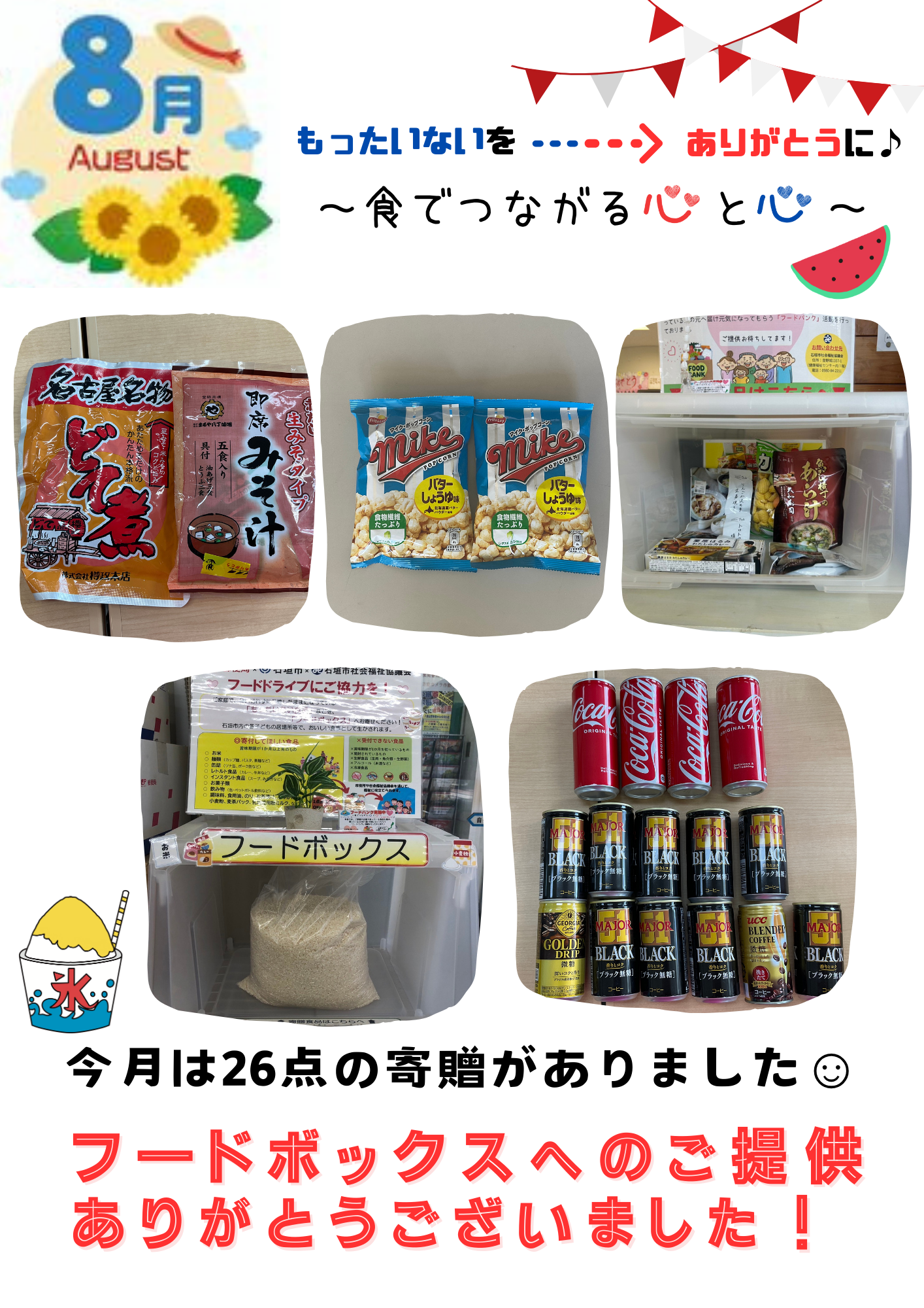 市内の郵便局や健康福祉センターに設置されているフードボックスに、8月は26点のご提供がありました。ありがとうございました!
