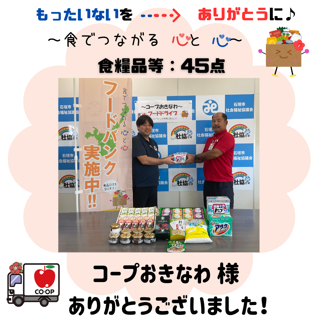 10月15日(水)、コープおきなわ石垣センター 様よりフードドライブで集めた食糧品等45点の寄贈がありました。
